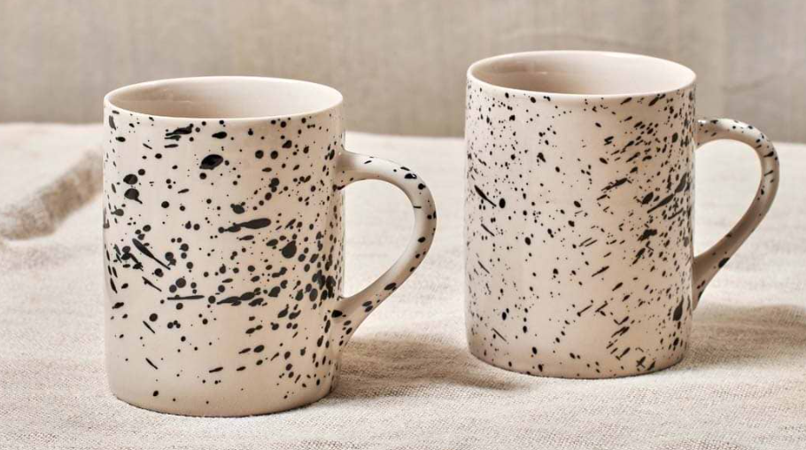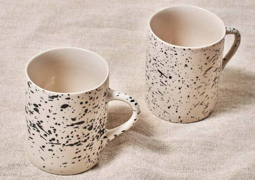 The Ama splatter mugs by Nkuku are handmade in Vietnam. They have a black splatter design and a tactile smooth gloss finish.