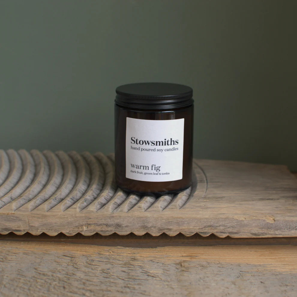 A Beautiful range of hand-poured soy candles from Stowsmiths of Chipping Norton, Oxfordshire. Hand-poured in an amber apothocary jar candle with screw top lid.