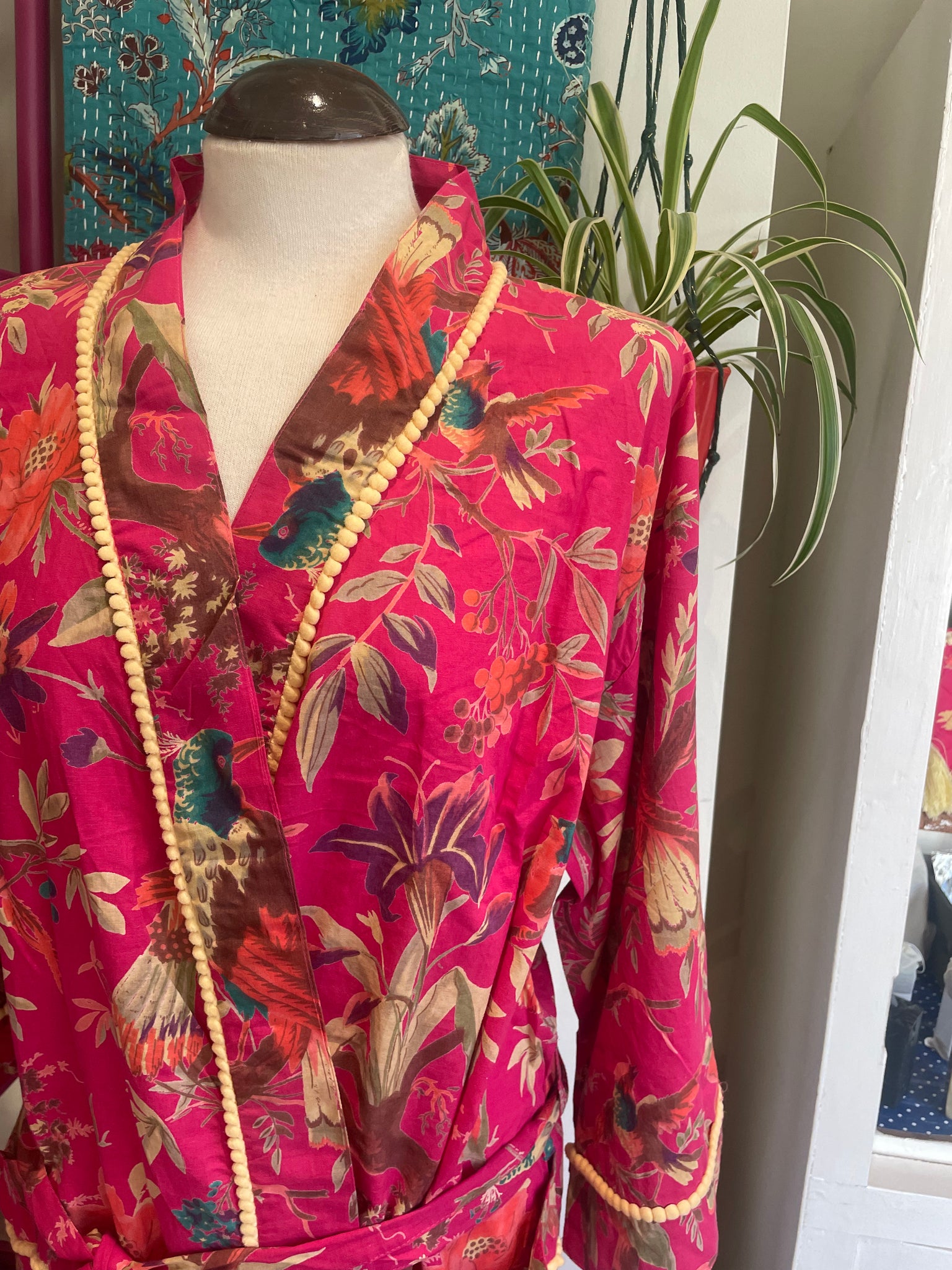 This safari-themed dressing gown features leopards, zebras, monkeys, and African birds against a backdrop of lush foliage and stylised trees. The print pops with greens, brown, highlights of mustard on a black background. The dressing gown is embellished with a soft green pom-pom trim on the cuffs, open front, and top of the pockets and it has a long matching waist tie belt.