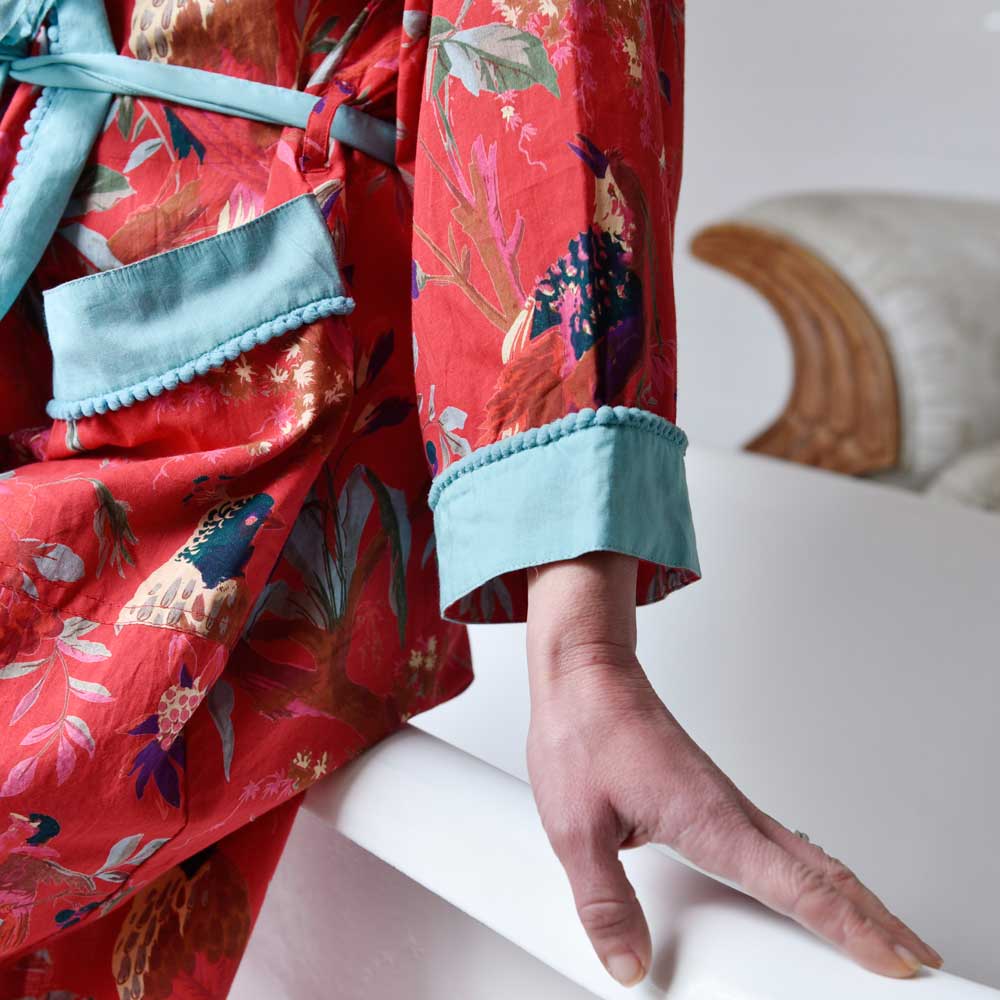 The print is complimented with a contrasting striped trim on the cuffs, open front, top of the pockets and the long waist tie.