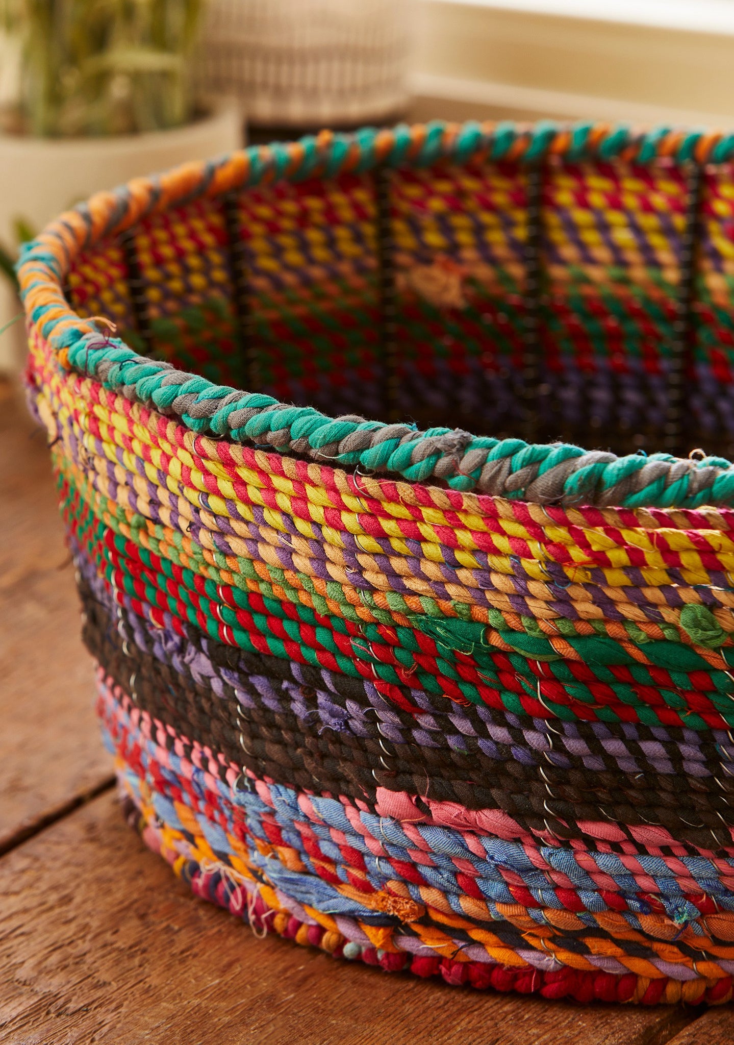 Robust Baskets made from recycled fabrics wrapped round a wire frame which means the basket keeps its shape. From fair trade company - Namaste.
