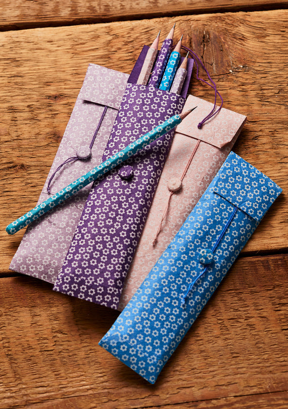 Five decorative paper-wrapped pencils by Namaste fair trade. Each Lokta paper packet is filled with 5 HB pencils wrapped in Green, Pink, Orange, Turquoise and Blue.