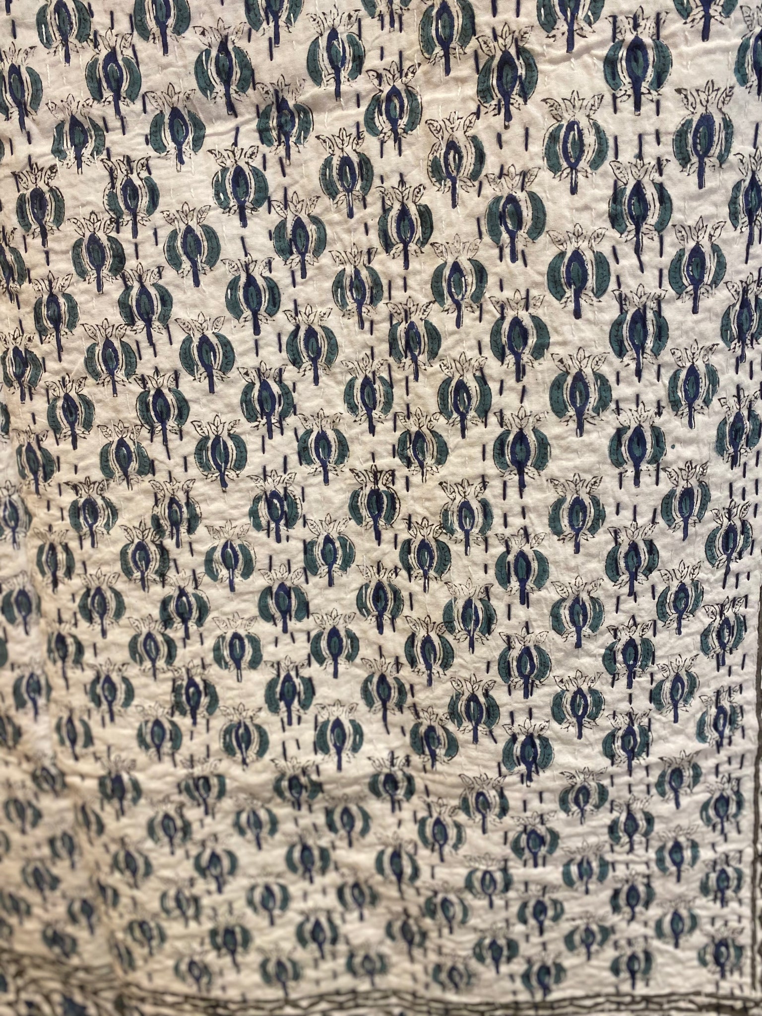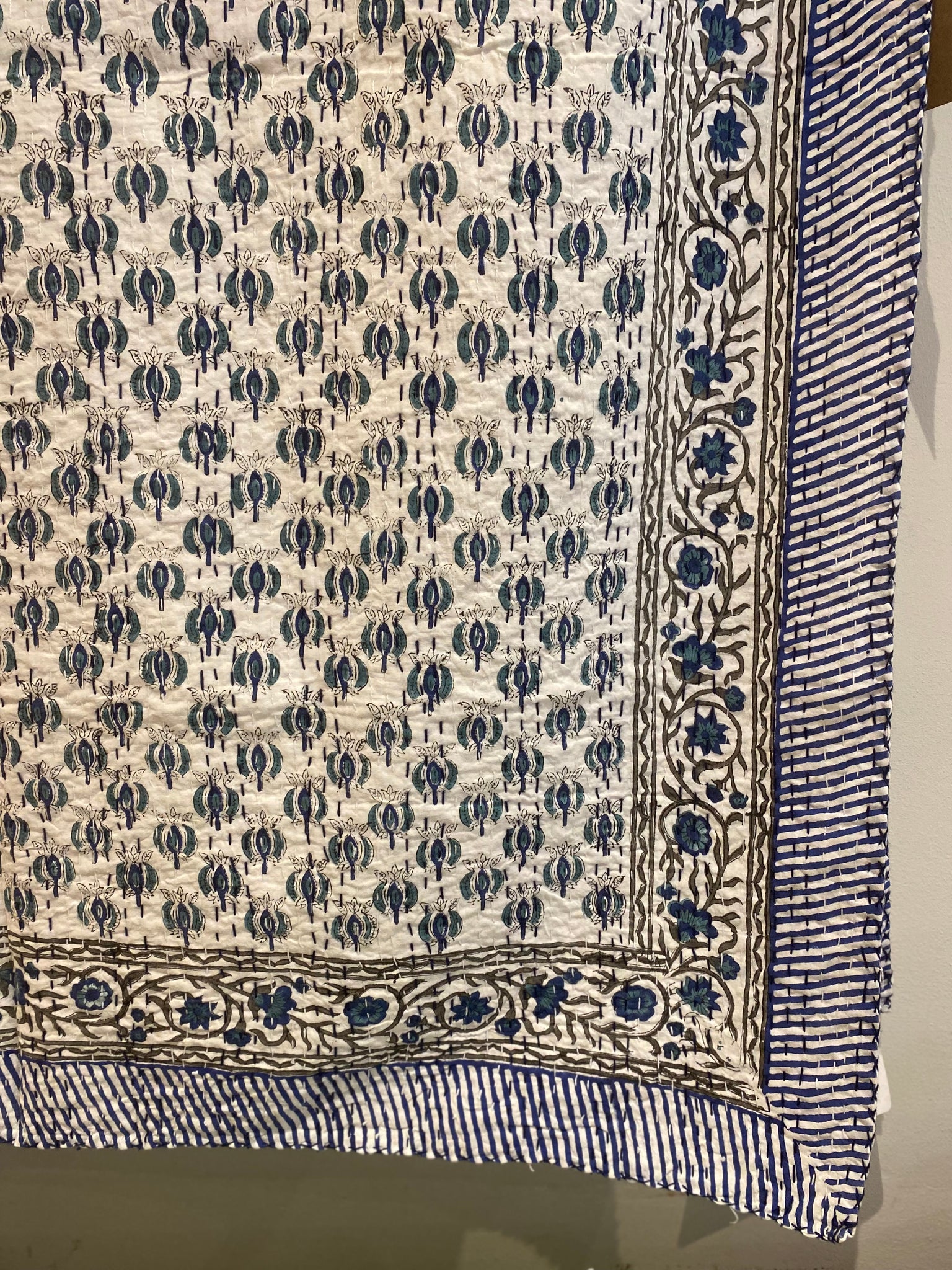 This hand block-printed quilted throw is soft and comfortable making it ideal as a topper for the bed in winter, or over a sheet in the Summer. An extra layer of loveliness.
